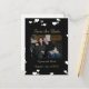 An black background with scattered floating hearts in various sizes. Gold colored font accents this photo save the date postcard. Add your picture and personalize with all of your information.