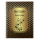 This notebook features an elegant black and gold scallop pattern with a cute graphic depicting a cat playing a guitar. The heading says, "Here I Write." The line below the script text can be changed to anything you wish. Currently the text shows "Song Lyrics." Writers need to have a notebook handy when ideas for a song or poem start flowing.