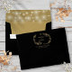 Elegant black and gold return address envelopes featuring pretty string lights on the inside and rustic hand-drawn floral on the flap, personalised with your names and address details in chic lettering. Designed by Thisisnotme©