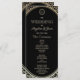 Elegant, chic black wedding program with gold floral swirls art-deco frame and monogram at the top.