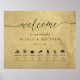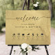 Welcome your guests with this elegant black and gold wedding welcome sign with timeline! Ability to customize sign with your details and your own wedding timing. If needed, you can select customize further using editing tool and re-arrange or move icon images and their text to suit you timeline needs by selecting images, or their text on editor screen and dragging them to where you like. Design with attractive gold print background and text and timeline icons in black. Modern hand written calligraphy details. Stylish, simple and clean design. Easy to frame or spray glue/staple to inexpensive MDF for display. Part of our "Black and Gold Monogram Wedding Collection" with a variety of coordinating products available. Visit the entire collection at: https://www.zazzle.com/collections/black_and_gold_monogram_wedding_collection-119092477004367833 Dimensions of sign in demo photo with stand: 24" x 18"