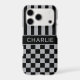 Customize this iPhone 17 pro case with black and gray stripes on the top half and black and gray checkered pattern on the bottom half with your name in a modern CAP font in the middle in gray on black. It's preppy, trendy and bold - definitely cool!