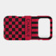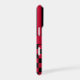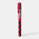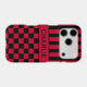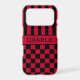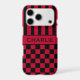 Customise this iPhone 17 pro case with black and red stripes on the top half and black and red chequered pattern on the bottom half with your name in a modern CAP font in the middle in black on red. It's preppy, trendy and bold - definitely cool!