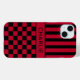 Customise this iPhone 15 plus case with black and red stripes on the top half and black and red chequered pattern on the bottom half with your name in a modern CAP font in the middle in black on red. It's preppy, trendy and bold - definitely cool!