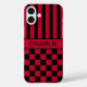Customise this iPhone 16 plus case with black and red stripes on the top half and black and red chequered pattern on the bottom half with your name in a modern CAP font in the middle in black on red. It's preppy, trendy and bold - definitely cool!