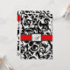 Black and Red Damask Wedding Invitations---match the RSVP cards and more found below on this page. Each invitation features a floral leaf damask print in white over a black background. The front and back also features a red band trimmed in black with a square monogram that you can customise to the groom's last name initial. These wedding invitations are set to high quality basic card stock; however, you can change the stock to linen, felt (embossed), recycled, and several metallic shades if you would like under number 2 (choose your style, size & paper type) below the orange add to cart button. A list of the additional costs for a fancier card stock are displayed also under that option. Each invitation comes with a fitted white envelope.