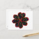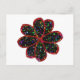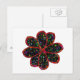 This fun postcard features a black flower with a red outline filled with multicoloured patterns that make the flower look like it is glittering. The image was created using graphic design and is both beautiful and delicate.
