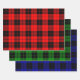 A wrapping paper sheet set with a plaid pattern in black on three background colours, red, green and blue. Customise the background colours, pattern sizes among other options.
