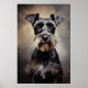 A close-up portrait of a black and silver Miniature Schnauzer, rendered in a painterly style. The dog has a serious expression, with its dark eyes looking directly at the viewer. Its black fur is detailed with subtle highlights and shadows, creating a sense of depth and texture. The dog's white beard and eyebrows add a touch of contrast to its dark coat.