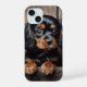 The image depicts Cavalier King Charles Spaniel puppy with black and tan fur. Cavie is sitting in a row, looking directly at the viewer. The puppy have large, expressive eyes and fluffy ears. The background is a soft, blurred brown, creating a warm and inviting atmosphere. The painting style is realistic, capturing the details of the puppys' fur and features.