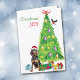On the front of this Christmas card, a Black and Tan Coonhound wears a Santa hat while he sits beside a Holiday tree. Brightly wrapped gift packages are scattered about, and a bullfinch is landing on the Christmas tree. The red and green text says "Christmas JOY". Inside is stylised text that says MERRY CHRISTMAS, and a text field for you to customise.