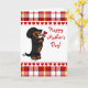 Unique and funny Dog Art painted by Naomi Ochiai from Japan. Cute and Funny Dachshund cartoon gift items for Dachshund fans!! An adorable Black and Tan Smooth Haired Doxie puppy is giving his/her tiny heart flower to his/her Mum. You can customise text and more! Mother's Day card design with red and white tartan plaid and tiny hearts.