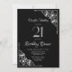 A black and white 21st birthday dinner invitation featuring ornate lace diagonal corners to frame the white text.