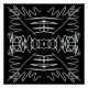 Black and white symmetrical pattern, white and gray lines and shapes on black background