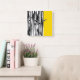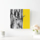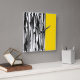 Wall clock printed with original black and white abstract stripes with bold yellow stripe.