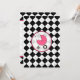 An invitation featuring a black and white argyle background with hot pink trim. Personalise the black and pink font text with details of your event. Opposite side is solid argyle with a hot pink baby carriage inside a matching circle shaped frame.