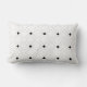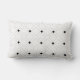 A modern Art Deco black and white designed rectangular pillow consisting of large black framed white squares with small black squares geometrically spaced amongst the larger squares.