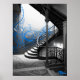 This cool poster is of an art deco style staircase in black and white with aqua blue vine accents on the exterior wall. Perfect for decorating your room!