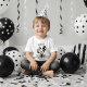 A cute axolotl themed personalised birthday shirt with black and white balloons with polka dots and an axolotl with birthday gifts and balloons.