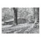 A black and white (B&W) winter travel photograph of a back-lit rural snow scene with a vintage barn and antique farm equipment under the trees. The fresh snow on the branches is sparkling in the morning sun.