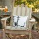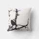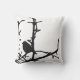 This contemporary outdoor pillow displays a black and white abstract pattern of a silhouette Dark-eyed Junco (Junco hyemalis) perched on a bare branch high in a tree. This bird is actually a kind of small, grey and white sparrow.