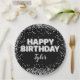 Black and white birthday party paper plates for a fun party with a modern classic look with glitter and foil balloons on personalised paper plates.