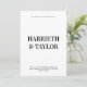 This wedding invitation features a clean, minimalist design with bold, centred typography, using large serif fonts for the couple’s names and smaller, uppercase text for the event details, all against a simple white background. The back has black background with 2 initial monogram.