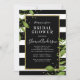 A bold, elegant bridal shower invitation with black and white stripes bordered in lush greenery and glitter confetti.