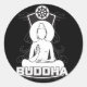 Buddha in meditation with the Dharma Wheel above and BUDDHA text below! All black and white Buddha design, unique and spiritual!