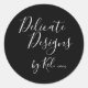 Your business name, or anything else, on a black background on these 1-1/2" round stickers. Change the font and the font colours.