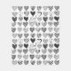 Playful cat tugging at a heart shaped balloon surrounded by different patterned hearts in black and white.