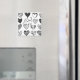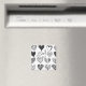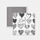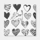 Playful cat tugging at a heart shaped balloon surrounded by different patterned hearts in black and white.
