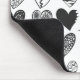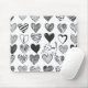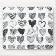 Playful cat tugging at a heart shaped balloon surrounded by different patterned hearts in black and white.