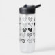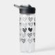 Playful cat tugging at a heart shaped balloon surrounded by different patterned hearts in black and white.