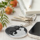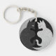 Striking black-and-white illustration of two cats facing each other within a circular frame. The left cat is depicted in light shades, while the right cat is dark. Their shapes intertwine to form a heart in the centre, symbolising connection or unity. Both cats have expressive eyes and distinct facial features, and the background is filled with intricate dot patterns that enhance the overall design. The contrast between the black and white adds depth and visual interest to the artwork