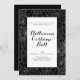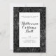 A chic design for a Halloween Party invitation. The border features a tangle of white cobwebs on a black background. On the front, you can change the details and the words "Halloween Costume Ball" to suit your event. On the back, there's plenty of space for you to add further details about your Halloween party and RSVP information in a modern white font on a plain black background.