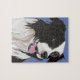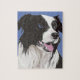 This unusual jigsaw puzzle features my drawing of a black and white Collie with blue eyes. The drawing is based on my own pet Gypsy, who was a loyal friend for many years. She had brown eyes, but I have also seen Collies with blue eyes, and even one of each!