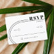 This wedding RSVP card exudes elegance with its black and white colour scheme and horizontal arched frame. The minimalist design showcases a contemporary typography and a unique arched layout. The card's standout feature is a gracefully curved line that starts from the bottom and gracefully runs along the left side, before seamlessly turning towards the right where it meets the word 'RSVP'. This sophisticated design is perfect for couples seeking a modern and stylish invitation for their special day.