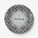 Black and White Damask Pattern Monogram and Name Paper Plate