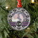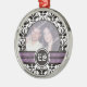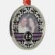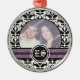 Black and white damask wedding photo ornament featuring your precious photo framed in black and white damask pattern black and purple bands and your initials in a circle.