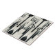 This ceramic tile has a cool pattern in black and white that looks like a modern Art Deco wallpaper. The design has lots of shapes that fit together in a fun way, including columns and totems. The pattern also has subtle colour changes and ultrafine details. This tile can make any space look more exciting and stylish.