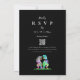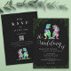 Make your wedding unforgettable with this unique black and white elegant dinosaur wedding invitation featuring a charming psychedelic multicolored T-Rex bride and groom illustration in pink, blue, orange, green, yellow, orange, purple and teal. Perfect for couples who share a love of dinosaurs, this fun funky yet elegant wedding invite blends playful Jurassic personality with modern botanical style.