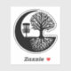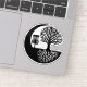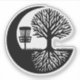 Disc golf themed vinyl sticker to stick on a water bottle, notebook or phone case. Black and white disc golf basket and tree roots silhouette.