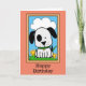 Adorable black and white puppy dog with big black floppy ears and a black patch over one eye. He is wearing a green collar with a yellow tag. He is sitting on some long green grass and yellow flowers on a summers day. He is framed by a light and dark orange frame. Below and inside are templates to add your own messages.