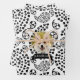 A black and white paisley pattern formed by dog paw prints and hearts in many sizes.