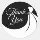 Black and white elegant gown bridal shower thank you, classic round sticker featuring an elegant wedding gown on a black background with a beautiful script white text with your thank you message. Perfect for envelope seals and favour stickers. You can customise the background colour to coordinate with your wedding theme.