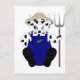 This design is an illustration of a black and white cow dressed as a farmer and holding a pitchfork.
