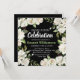Gorgeous display of white peonies frames this black square graduation invitation. All of the text is white, except for the graduate's name. It is a light and bright green that matches many of the peony leaves.