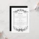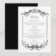 This elegant wedding menu features a classic black-and-white design with refined botanical flourishes framing the top and bottom. Delicate vertical lines and ornamental greenery create a timeless, formal look, while graceful typography guides the eye through each course. The layout is clean and well-balanced, presenting hors d’oeuvres, dinner courses, and dessert in a polished, understated style that complements traditional, romantic, or modern-classic wedding celebrations.