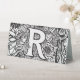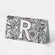 Add a dramatic and functional touch to your wedding or formal event with this double-sided table tent sign featuring a bold floral monogram “R.” The front showcases intricate black and white botanical artwork for a statement display. The back includes a clean, editable layout with “TABLE XX” and space to list up to eight guest names in two columns. Ideal for seating arrangements at weddings, rehearsal dinners, or upscale receptions.